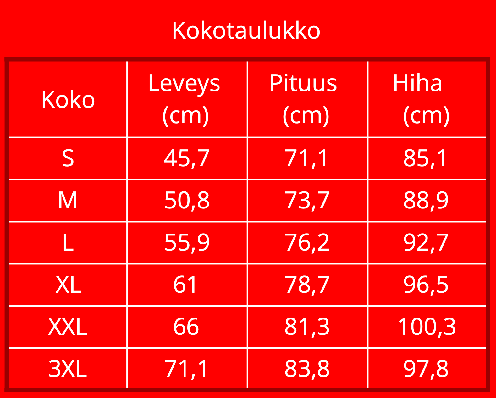 Koot: S / M / L / XL / XXL / 3XL